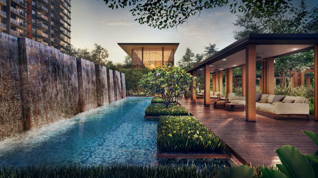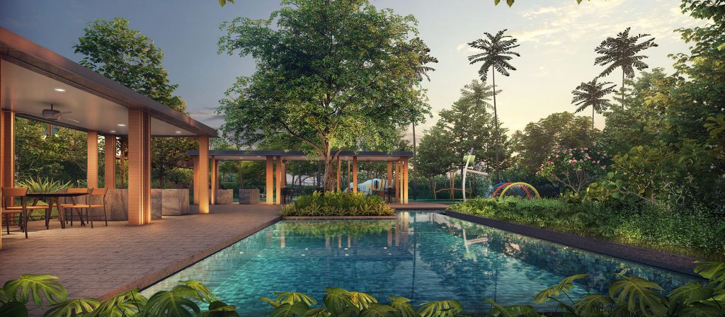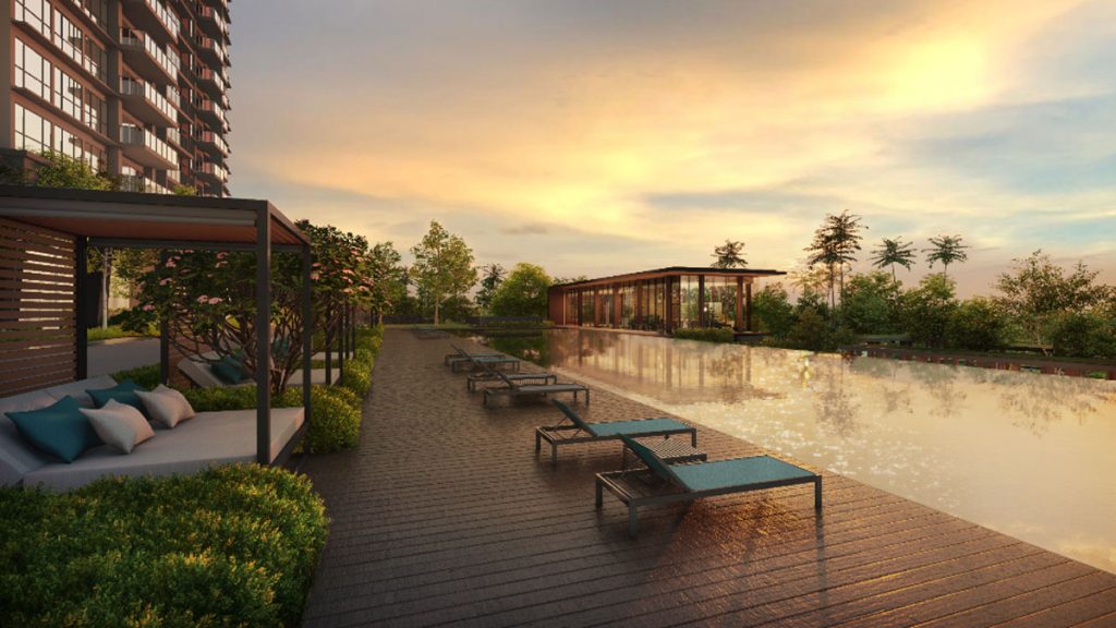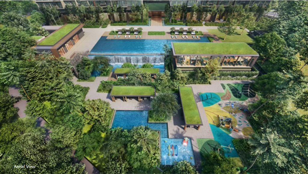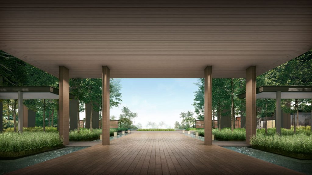 As you enter through the grand entrance, the landscape is designed in a way that is forested on both sides which provides a tunnel approach to the facilities as you look over the edge of the pool towards the horizon. As you approach towards the end of the forest corridor, the landscape opens up to a 50 meters infinity lap pool deck with water that cascades to the leisure pool at the lower facilities deck.